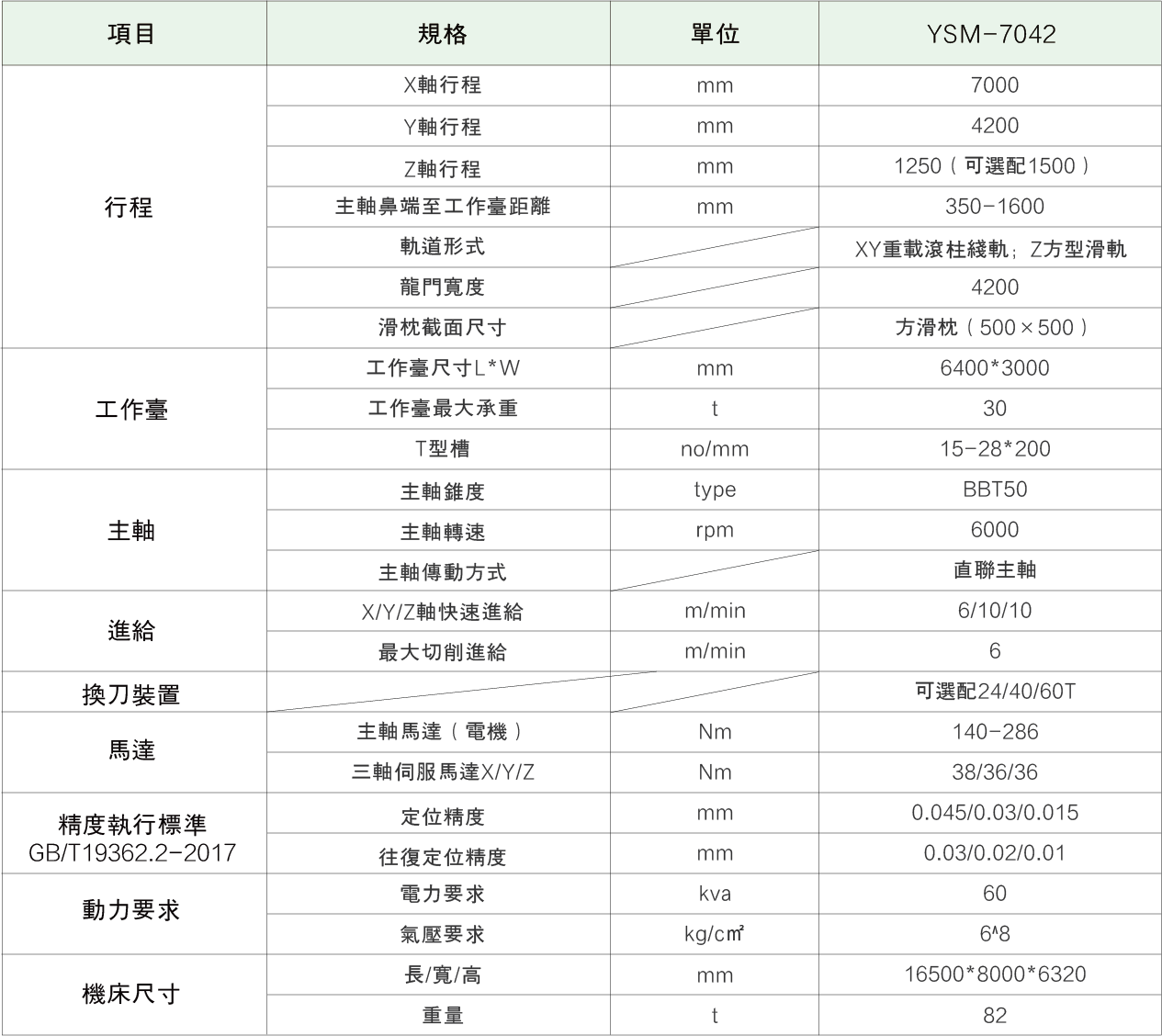 主軸采用22/26KW大扭矩交流伺服電機驅動,主軸變速采用自動兩段高低檔變速箱。變速箱潤滑油溫采用獨立油冷裝置控製;主軸帶有自動拉刀裝置,液壓松開、碟簧拉緊,松、拉刀檢測,安全可靠;主軸采用BBT50高剛性主軸,超強切削力;